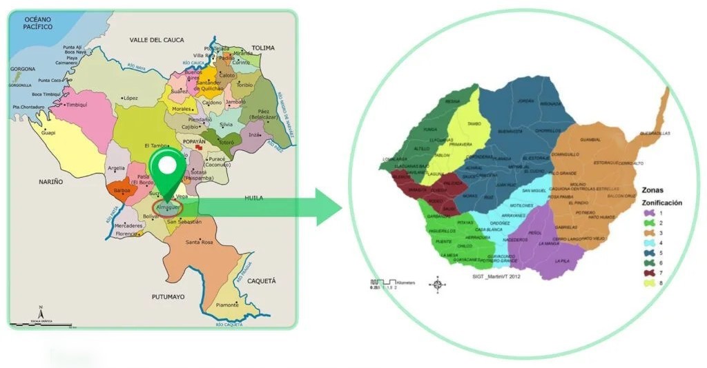El Municipio de Almaguer, ubicado a 172 km al sureste de Popayán, en el Departamento del Cauca, forma parte del Macizo Colombiano, una región conocida como la principal fábrica de agua de Colombia. La población se encuentra al pie de las colinas de Belén, Panecillos y Santa Bárbara, rodeada por la cordillera de los Andes, que se divide al noreste para formar las dos ramas gigantescas de los andes Colombianos. (Wikipedia, 2025)